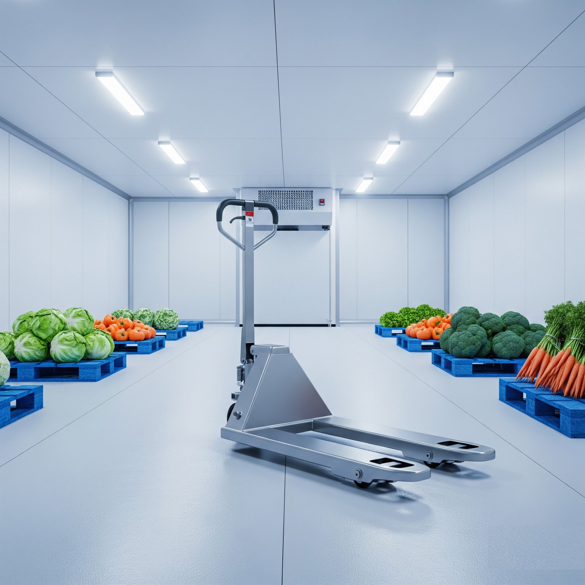 ใช้รถลากพาเลทรุ่นที่เป็น Stainless Pallet Truck ทั้งคัน สำหรับห้องเย็นหรือพื้นที่มีความชื้น
