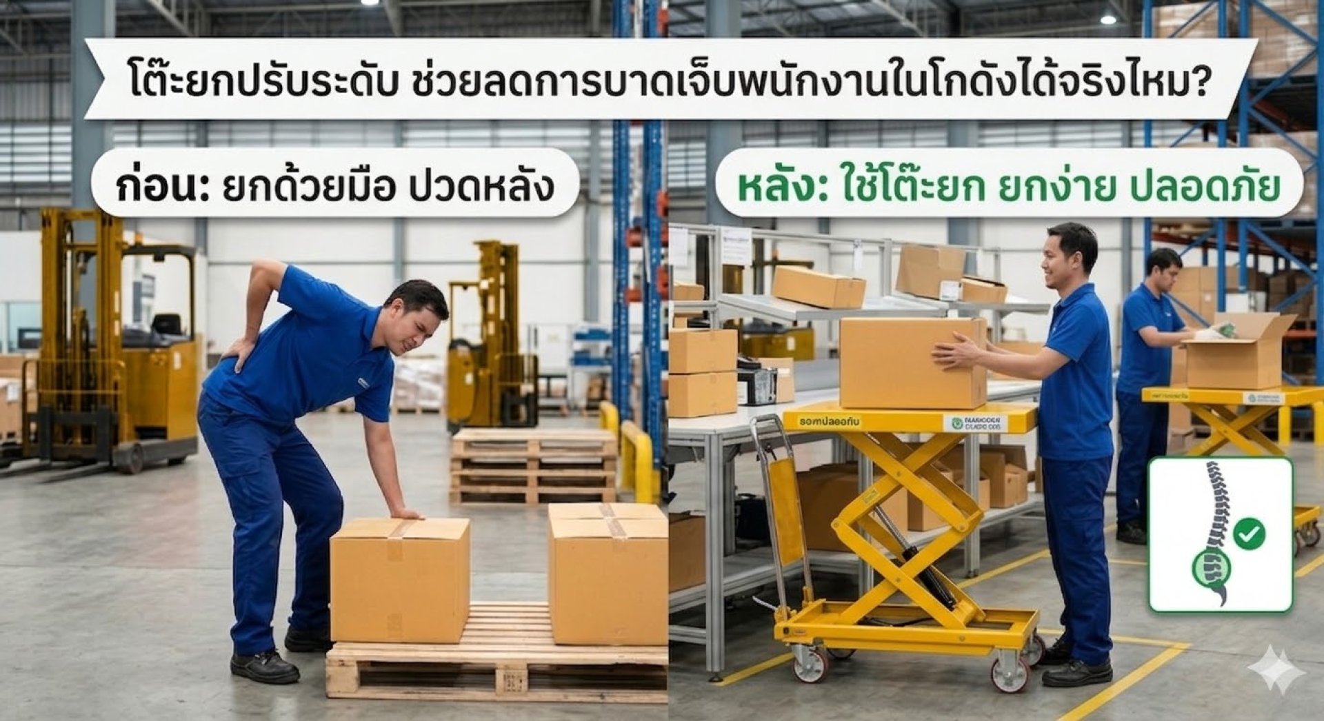 ในยุคที่ E-Commerce เติบโตอย่างก้าวกระโดด คลังสินค้ากลายเป็นหัวใจสำคัญของธุรกิจ แต่สิ่งที่ตามมาอย่างเลี่ยงไม่ได้คือภาระงานที่หนักหน่วงของพนักงาน โดยเฉพาะ "การยกและเคลื่อนย้ายสินค้า" ข้อมูลทางสถิติระบุว่า อาการบาดเจ็บที่หลัง (Back Injury) เป็นสาเหตุอันดับต้นๆ ที่ทำให้พนักงานต้องลางาน และเสียโอกาสในการทำงานมหาศาล